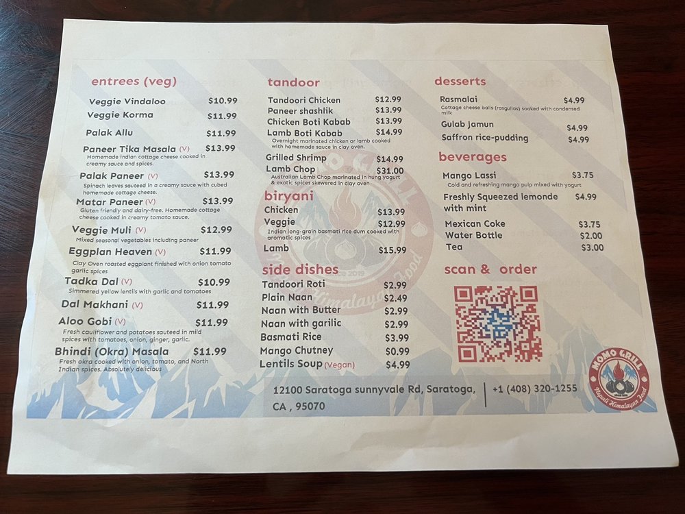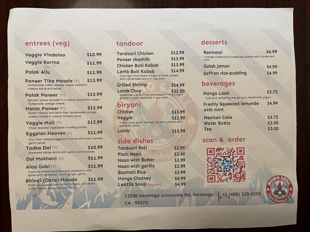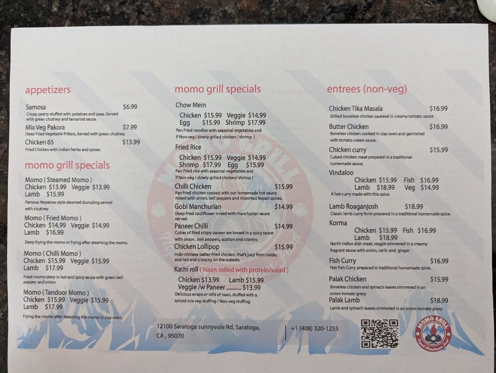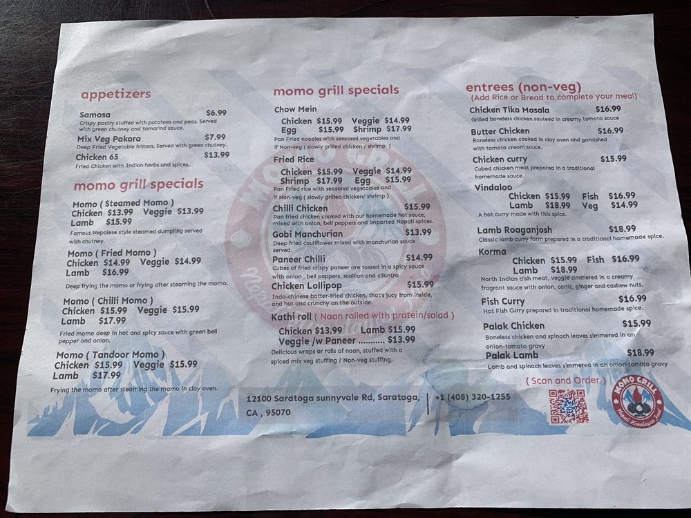 Introducing Momo Grill, a Halal restaurant offering Himalayan/Nepalese and Indian cuisine. Located in Saratoga, CA, Momo Grill boasts a menu full of flavorful dishes like Chicken 65, Momo Steamed, and Paneer Tikka Masala. Customers rave about the attentive service and delicious food, with options for vegans and vegetarians. The ambiance is casual, with outdoor seating and a moderate noise level, ideal for lunch or dinner. Standout dishes include the Gobi Manchurian, Eggplant Heaven, and Momos in various styles. With happy hour specials, alcohol, and gender-neutral restrooms, Momo Grill caters to diverse tastes and preferences. Overall, Momo Grill is a must-visit spot for authentic and flavorful Asian cuisine.