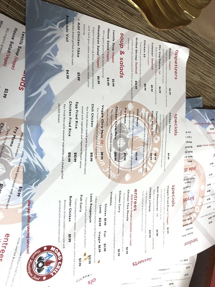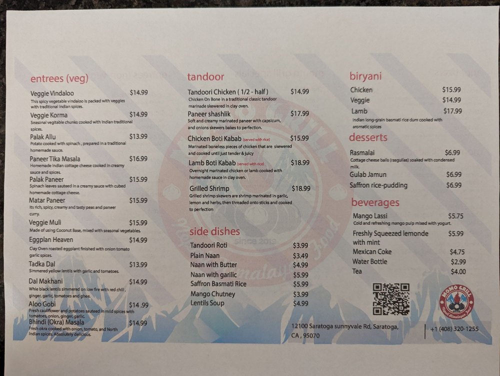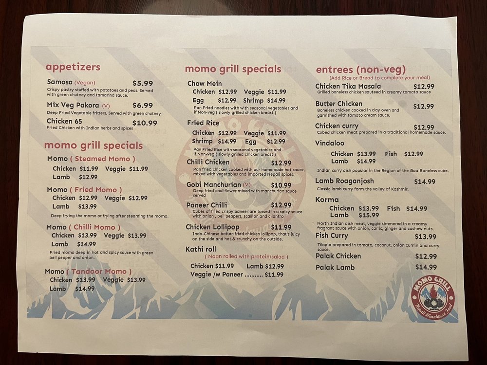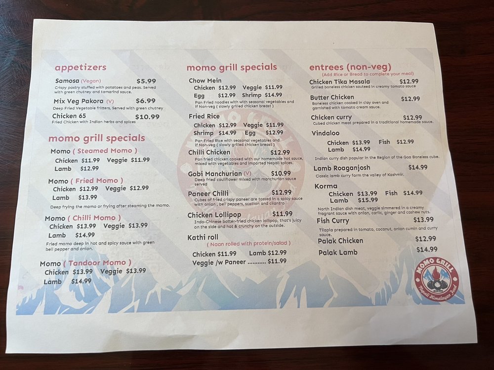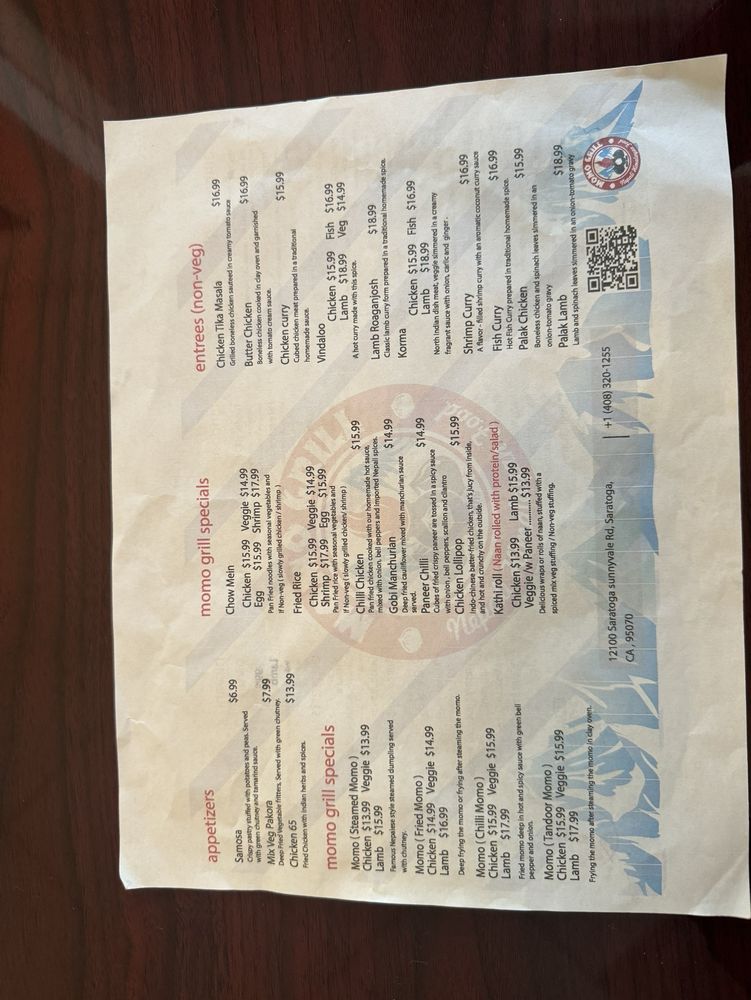 Introducing Momo Grill, a Halal restaurant offering Himalayan/Nepalese and Indian cuisine. Located in Saratoga, CA, Momo Grill boasts a menu full of flavorful dishes like Chicken 65, Momo Steamed, and Paneer Tikka Masala. Customers rave about the attentive service and delicious food, with options for vegans and vegetarians. The ambiance is casual, with outdoor seating and a moderate noise level, ideal for lunch or dinner. Standout dishes include the Gobi Manchurian, Eggplant Heaven, and Momos in various styles. With happy hour specials, alcohol, and gender-neutral restrooms, Momo Grill caters to diverse tastes and preferences. Overall, Momo Grill is a must-visit spot for authentic and flavorful Asian cuisine.